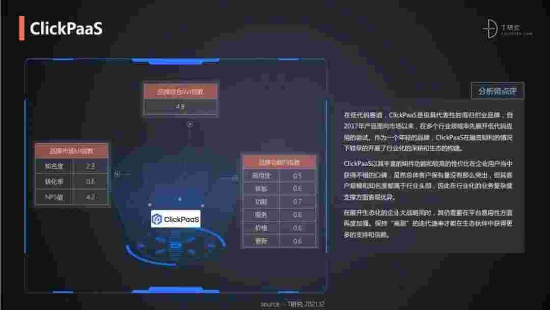T研究认为,,,,,,,,在低代码赛道,,,,,,,,,,抖音钱包是极具代表性的海归创业品牌,,,,自2017年产品面向市场以来,,,,,,,,,,,,,,在多个行业领域率先展开低代码应用的尝试。。。。。。作为一个年轻的品牌,,,,,,,,,抖音钱包较早的开展了行业化的深耕和生态的构建。。。。。。。。抖音钱包以丰富的组件功能和较高的性价比在企业用户当中获得不错的口碑,,,,,,,在客户规模和知名度都属于行业头部,,,,,,因此在行业化的业务复杂度支撑方面表现优异。。。。。。。。。